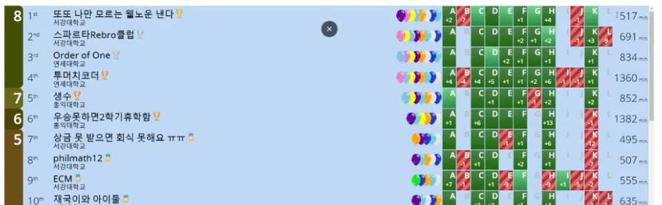 10등까지가 5솔브였는데, 총 문제수가 12문제였습니다.