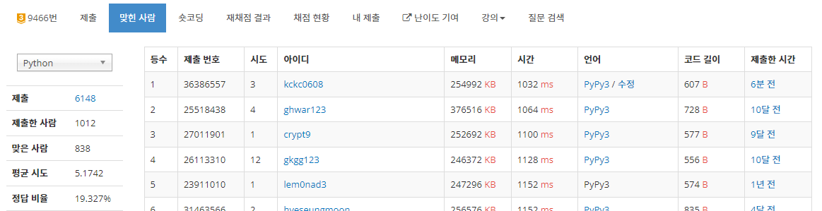 살면서 처음으로..!! python 그룹 언어에서 제일 빠르게 푼 사람이 되보았다 ㅋㅋㅋ