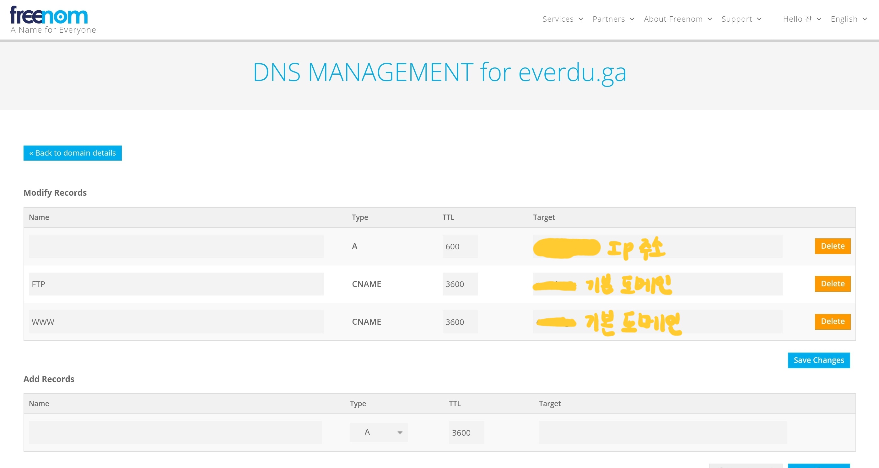 도메인을 구매한 곳에서 도메인 관리페이지로 가면 다음과 같이 도메인 명을 관리할 수 있는 창이 나온다.