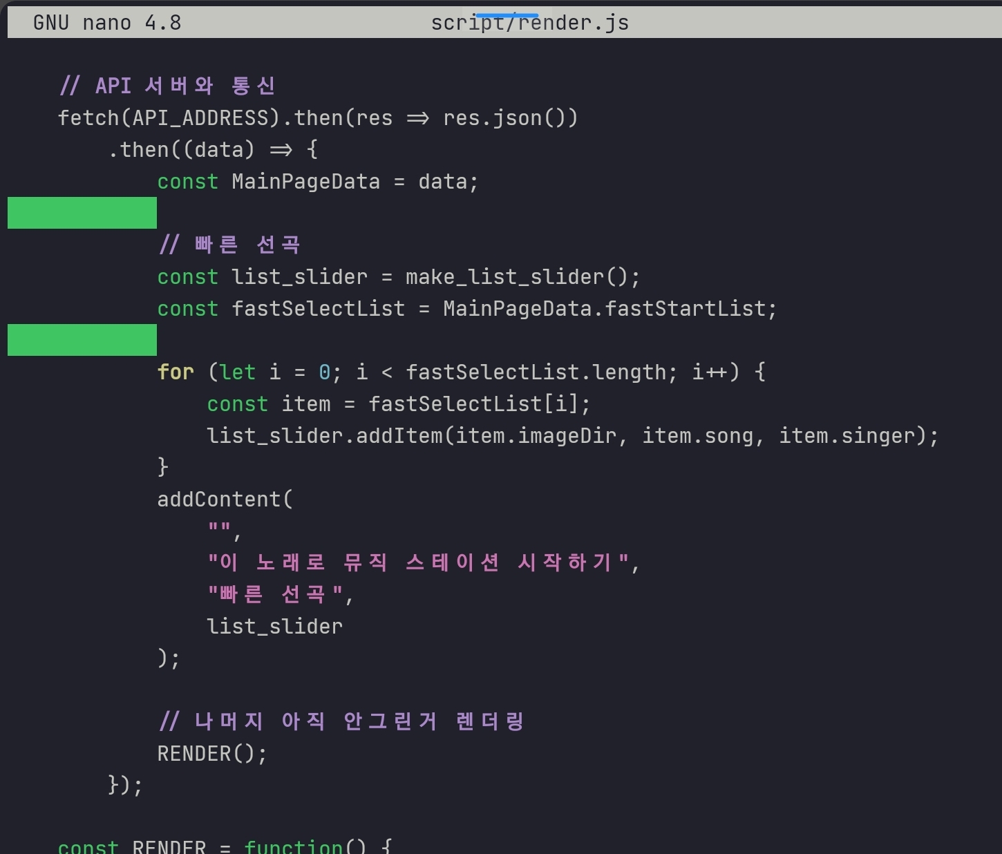 fetch 메소드의 then 메서드에서 실행시켜 '빠른 선곡'이 렌더링 된 이후에