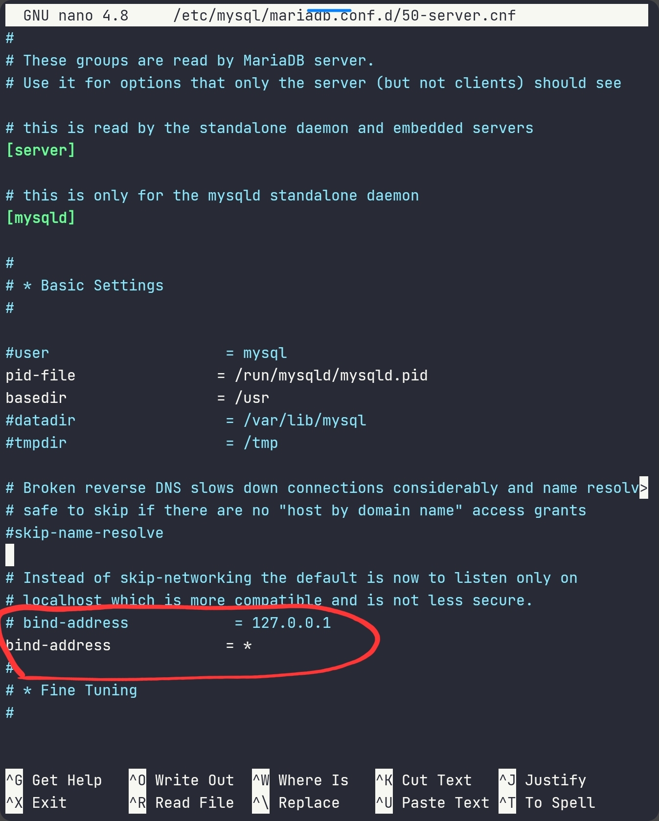 sudo nano /etc/mysql/mariadb.conf.d/50-server.cnf