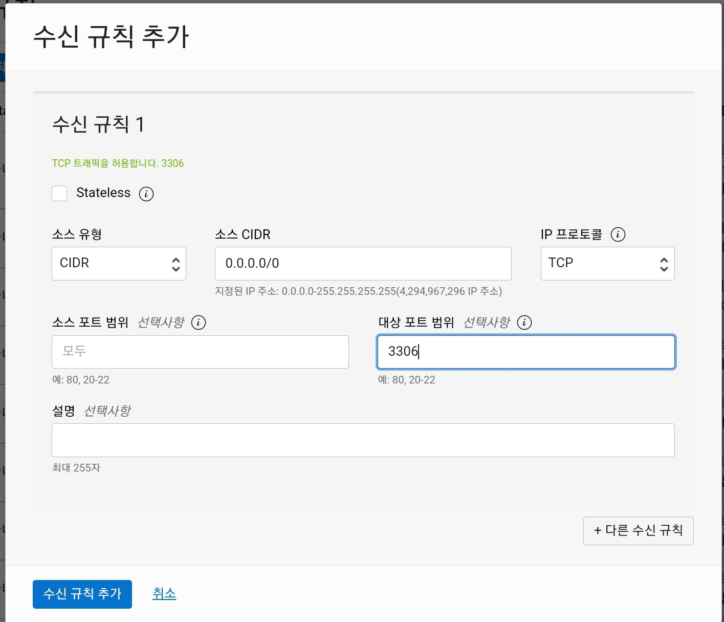 우리는 3306 포트를 허용할 예정이므로 3306 포트를 대상 포트에 적어주고,