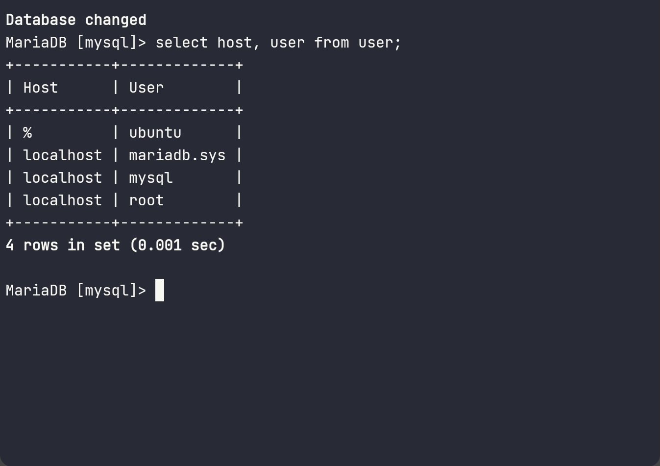 저는 호스트가 %로 어떤 호스트에서도 접속이 가능한 ubuntu 유저를 생성해주었습니다.