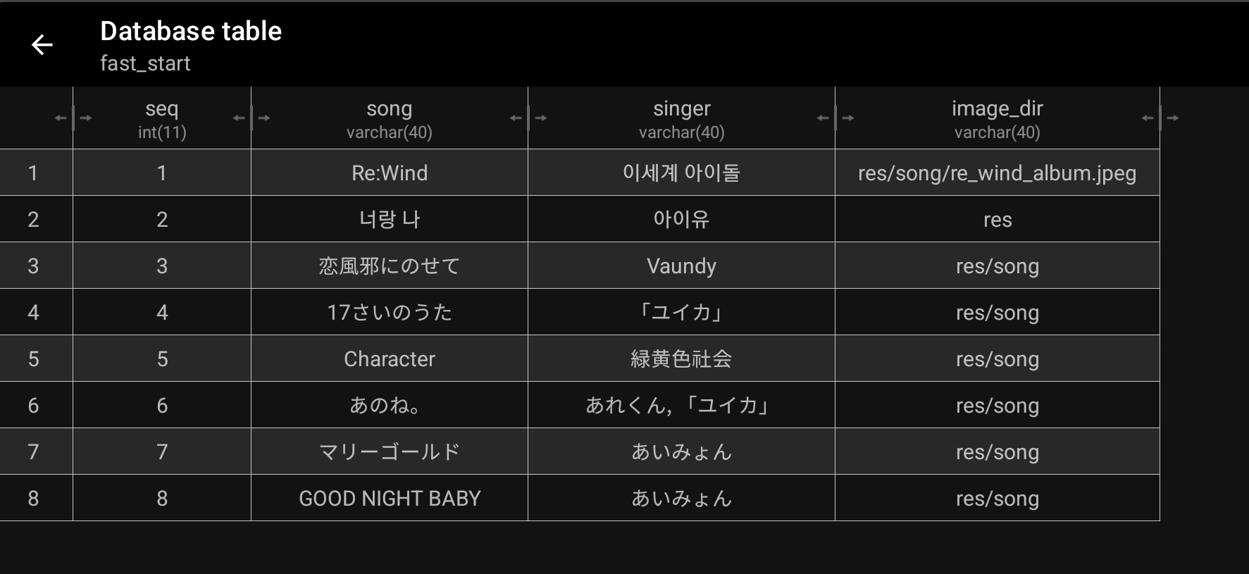 노래 하나 말고는 아직 노래 이미지 파일을 서버에 넣어두지 않아서 그냥 임의 경로를 저장했다.