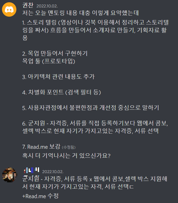 멘토링이 끝나고, 팀원분과 멘토링 내용을 정리했다