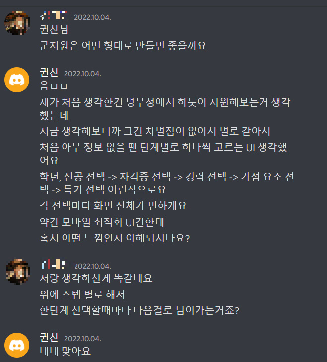 군지원 기능에 대해 서로의 의견을 확인하고 프론트 구현이 시작되었다.