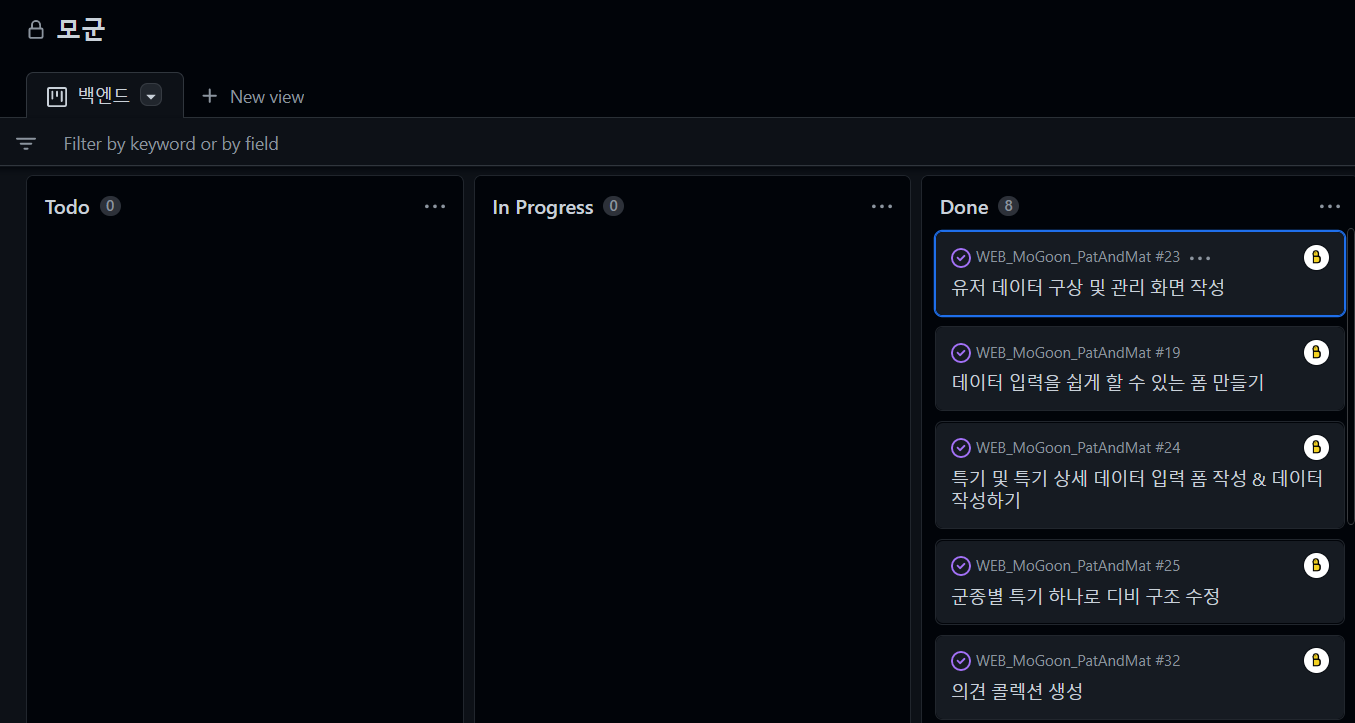 이건 이슈를 이용해서 깃허브 프로젝트에 있는 칸반보드를 사용했던 내역