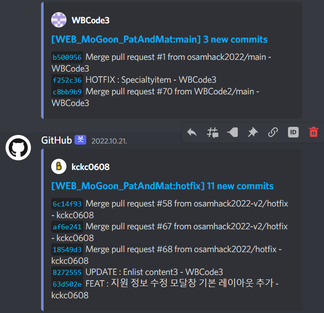 웹 훅을 이용해서 이렇게 푸쉬 알림을 받는 채널을 따로 만들었다.