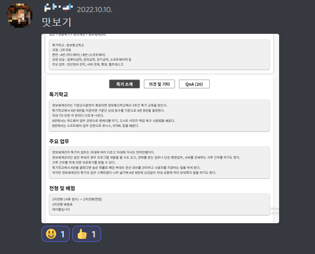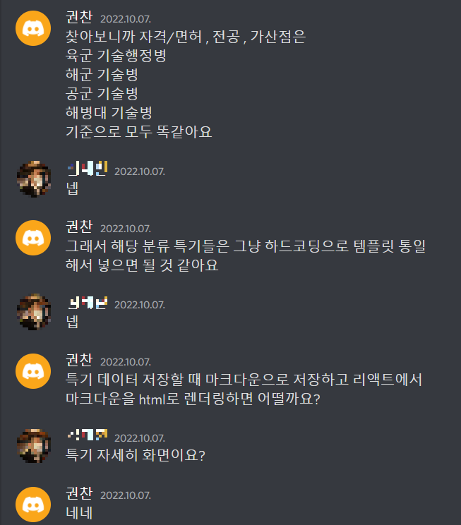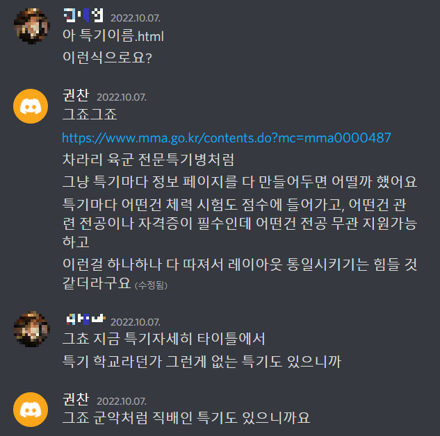 | [국방오픈소스아카데미 해커톤] 4. 특기 상세 페이지 만들기 & 멘토링 1회차 (2) | 2022.11.06 |