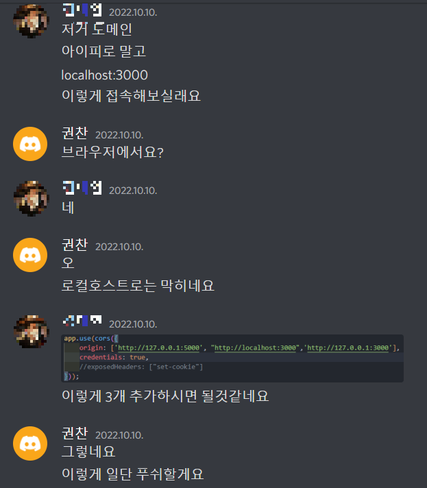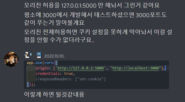 근데 쿠키 설정을 하다보니 중간에 cors 문제가 다시 발생했다.