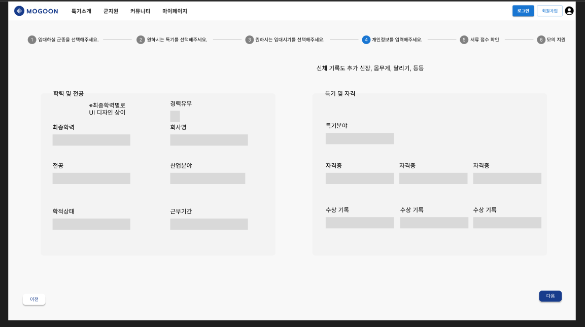 그리고 군지원 페이지 초안 구현 결과가 나왔다