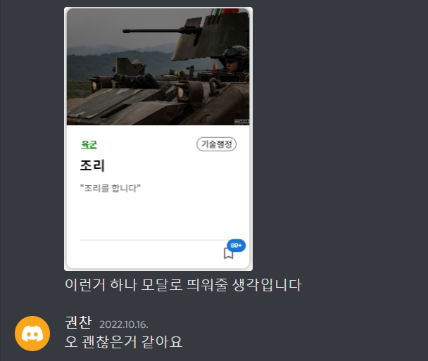 | [국방오픈소스아카데미 해커톤] 5. 특기 상세 페이지의 의견탭 구현하기 & 로그인 구현하기 (0) | 2022.11.08 |