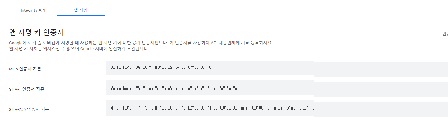 화면에서 '앱 서명' 탭을 클릭하면 이렇게 인증서 지문이 나오는데, SHA-1 인증서 지문을 복사한다.