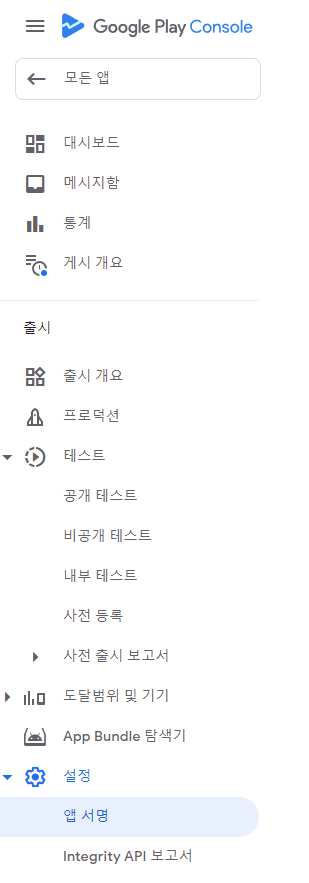 구글 플레이 콘솔에 들어가서 앱을 선택한 뒤, 설정 > 앱 서명 에 들어간다.