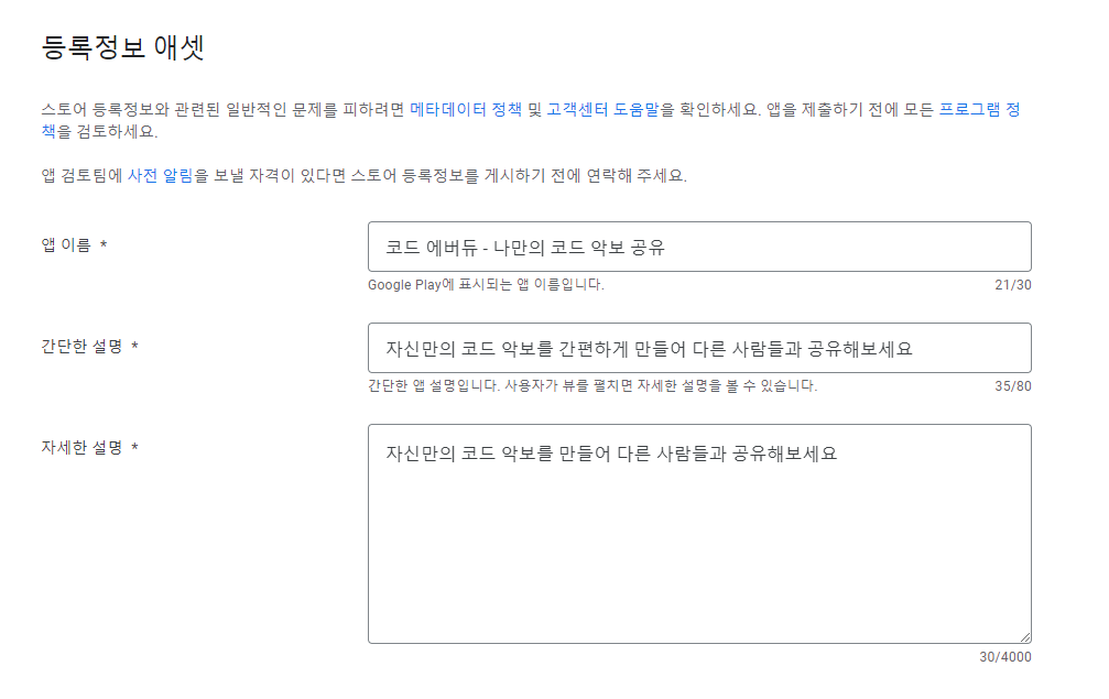 그리고 앱을 등록할 때 개인정보 처리방침 URL을 올리게 되어있다.