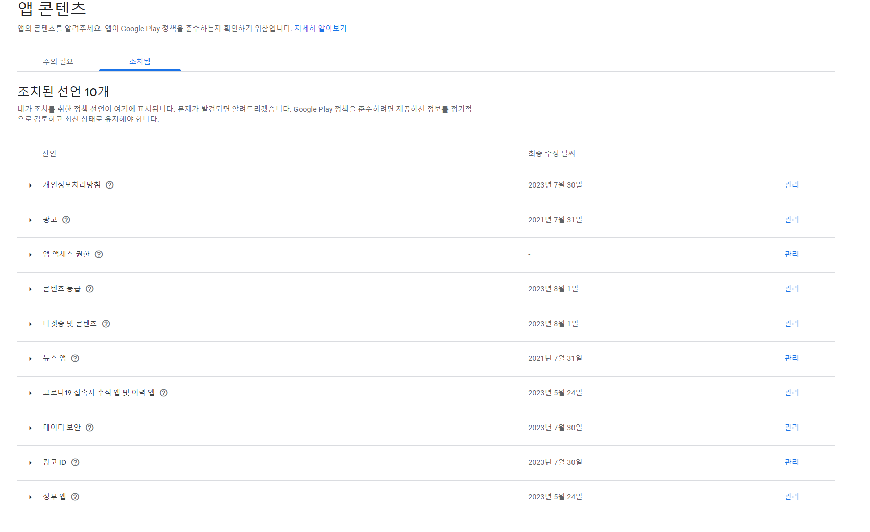 앱 콘텐츠 정책도 구글에서 제공하는 설문조사를 완료하면 세팅이 된다.