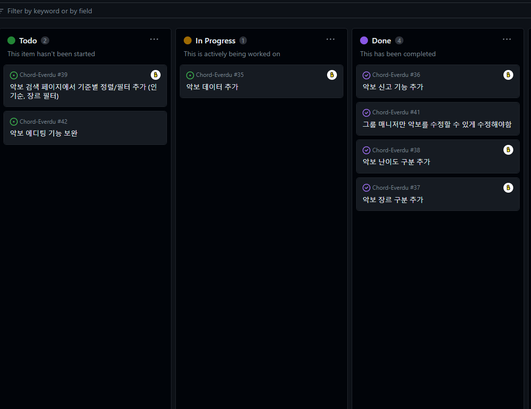 최근에 이 프로젝트에 깃허브 프로젝트 기능을 이용해서 task 관리를 하고 있는데 아주 좋은 것 같다.