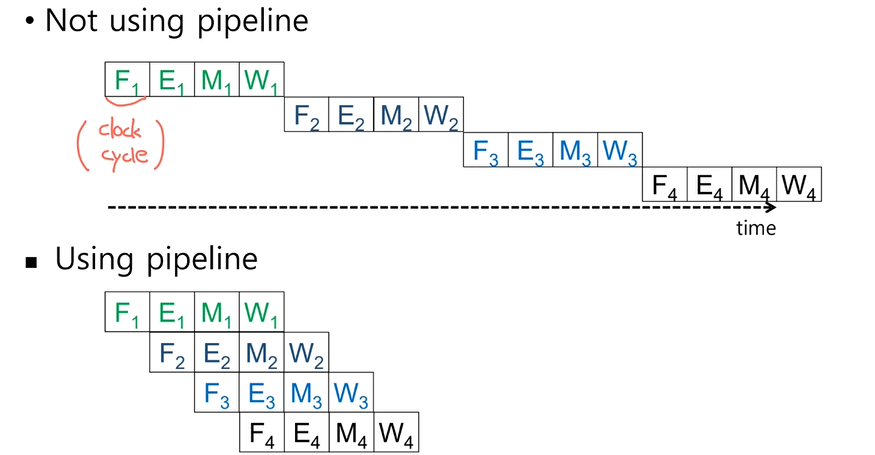 '파이프라이닝' 이라는 기법을 이용해서 전체 명령어 처리 시간을 줄일 수 있다