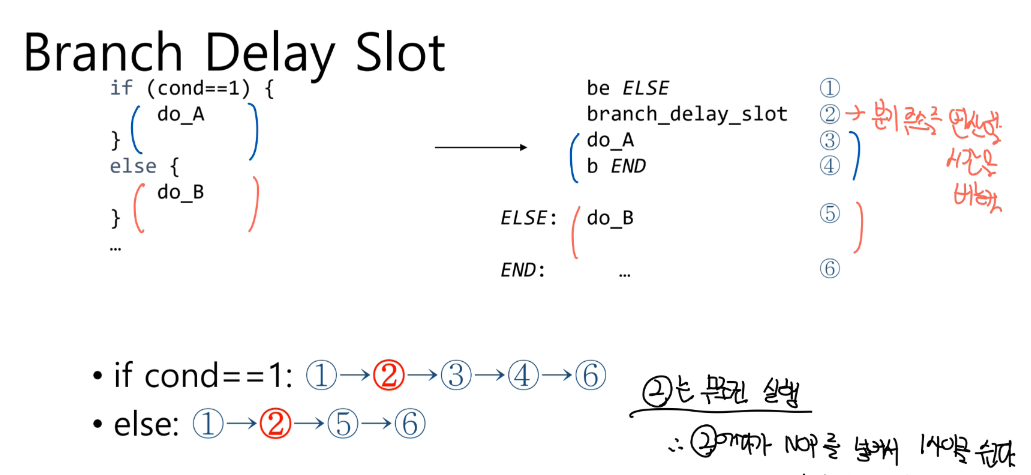 이렇게 분기명령어 다음에 무조건 실행되는 명령어 위치를 'Branch Delay Slot' 이라고 부른다.