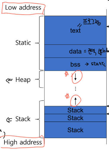 메모리의 주소가 낮은 곳부터 차례대로 Static Heap Stack 순으로 영역이 존재한다.