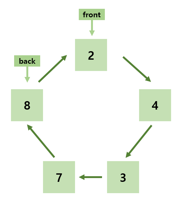 이렇게 circular 형태로 된 큐라면 이 상황에서 back 다음위치에 데이터를 새로 push 하는 것이 어색하지 않다.
