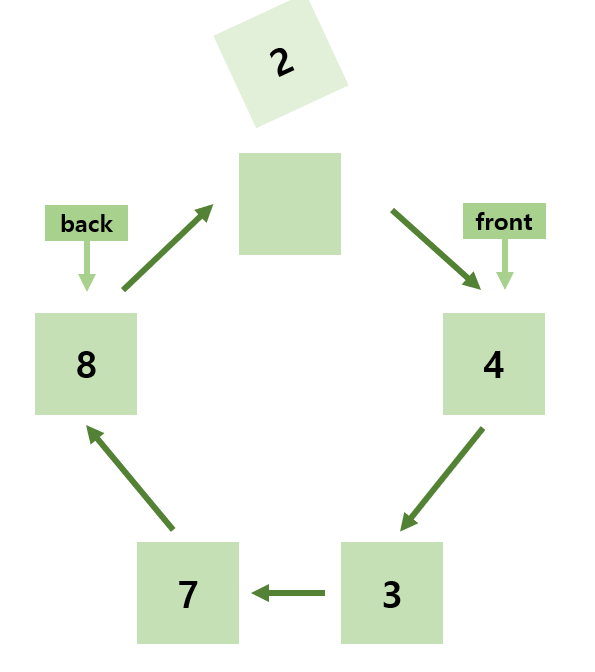 front에 있는 2가 나오고, 0번 인덱스의 값이 비게 된다.