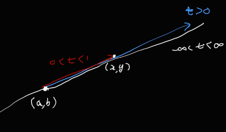 0 < t 이면, (a,b) 로부터 뻗어나가는 반직선 (광선) 을 나타내며,