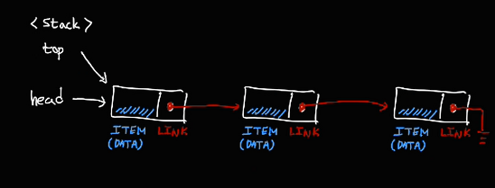 스택의 데이터 삽입과 삭제가 빈번히 일어나는 top 을 연결리스트의 첫 head로 설정하자.