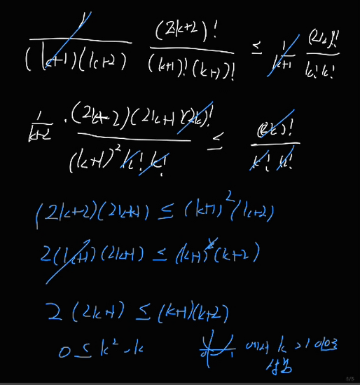 2(k+1)C(k+1) / (k+1)(k+2) <= 2(k+1)C(k+1) / (k+1)(k+2) <= k! 에서 성립한다.