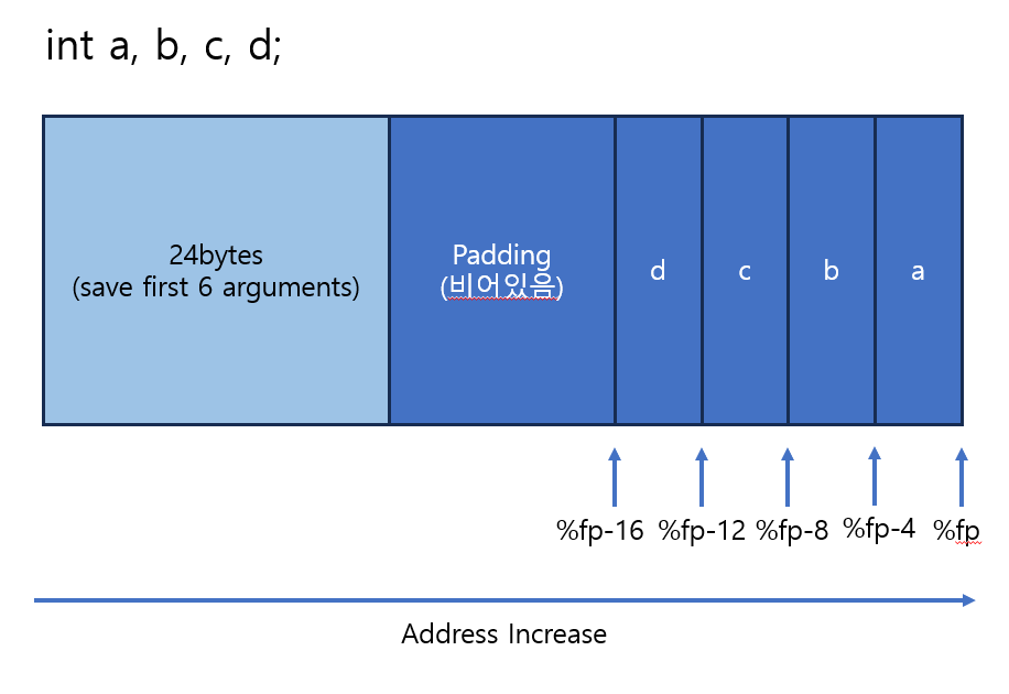 만약 위 그림처럼 int형(4바이트)의 지역 변수를 4개 생성한다면, %fp에 가까운 쪽부터 차례대로 할당된다.