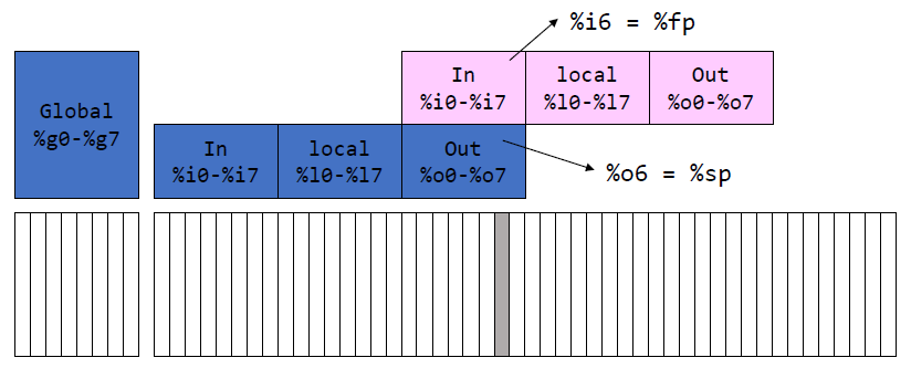하나의 서브루틴에서 볼 때, %fp는 스택 프레임의 시작 주소, %sp는 스택 프레임의 끝 주소와 같다.