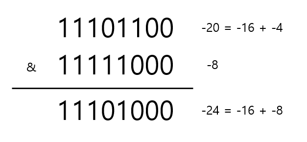 8의 배수가 아닌 -20에 & -8 연산을 한 결과를 살펴보자.
