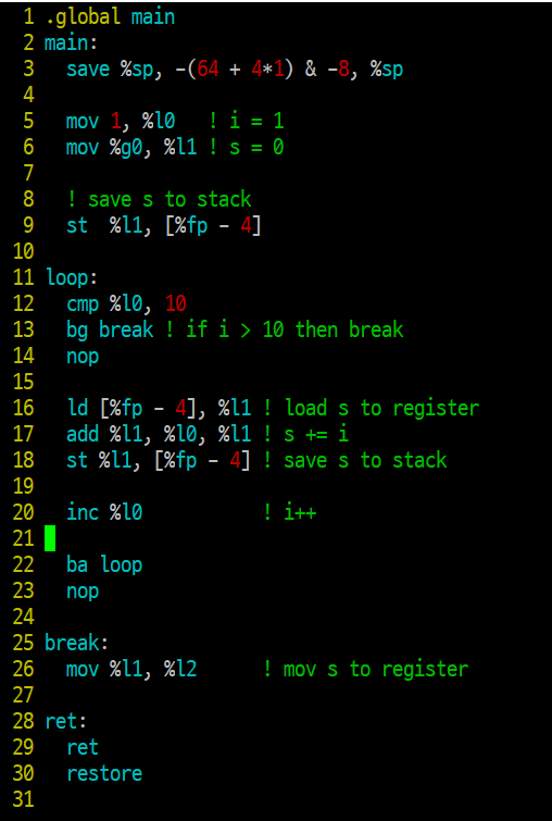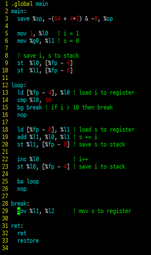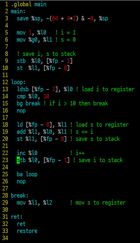 기존에 작성하였던 코드에서 i가 들어가는 부분만 stb, ldsb 로 바꾸어주고, 접근 주소값을 %fp-1로 바꾸어주면 된다.