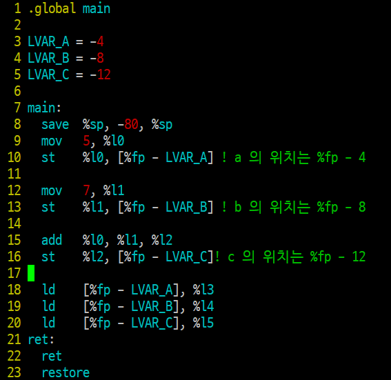 지금은 직접 임의로 a, b, c 의 값을 %fp 와의 상대주소에 넣었는데, 실제 컴파일할 때 이렇게 된다는 것으로 이해하면 될 것 같다.