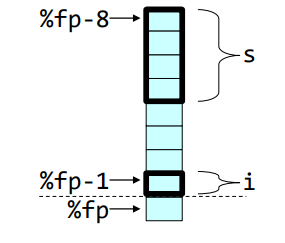 따라서 i 는 %fp-4 위치에, s는 %fp-8 위치에 저장될 것이다.