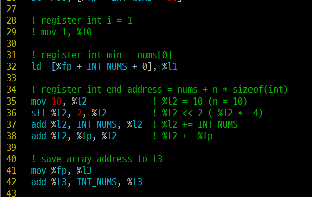 즉, 위 예제에서 배열의 i번째 원소의 메모리 주소는 %fp - 24 + 4*i = 시작주소 + 4*i 이다.