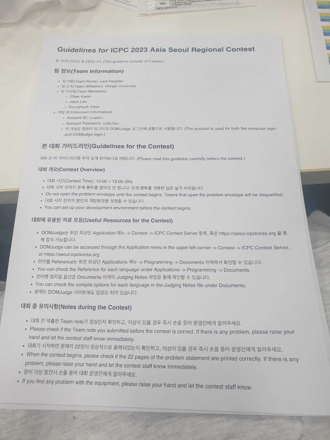 자리에는 본선때와 마찬가지로 물 한병씩과 연습장 하나, 볼펜 2개가, 문제지가 들어있는 봉투, 팀노트가 들어있는 봉투, 대회 계정 안내 종이가 있었다.