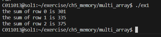 3 x 4 배열을 선언하고, 각 행의 합을 구해서 1차원 배열에 저장하는 코드이다.