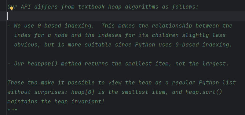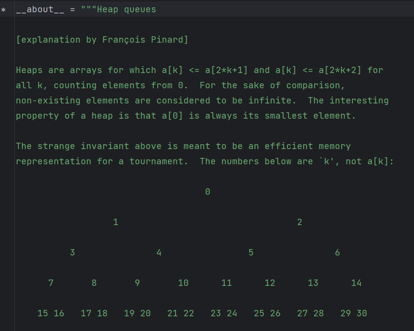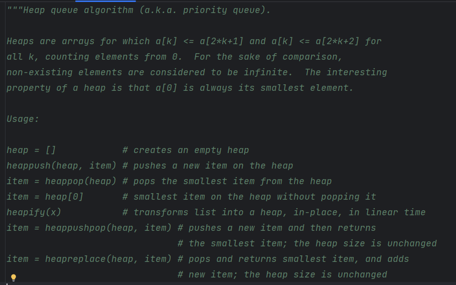 코드 상단부에는 이렇게 heapq 모듈에 대한 설명과 사용 방법이 소개되어 있다.
