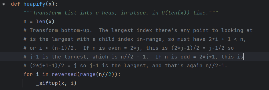 우선 반복문을 반만 돌아도 괜찮은 이유는, 기존 배열을 힙으로 구성하였때, 이미 n//2 개 노드는 leaf 노드에 있어 (위 글의 표현을 빌리면) siftdown 이 발생하지 않기 때문이다.