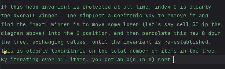 이 작업을 모든 원소에 대해 반복하면 작은 순으로 뽑아내는 정렬에 O (n log n) 시간이 걸린다는 것도 말해준다.