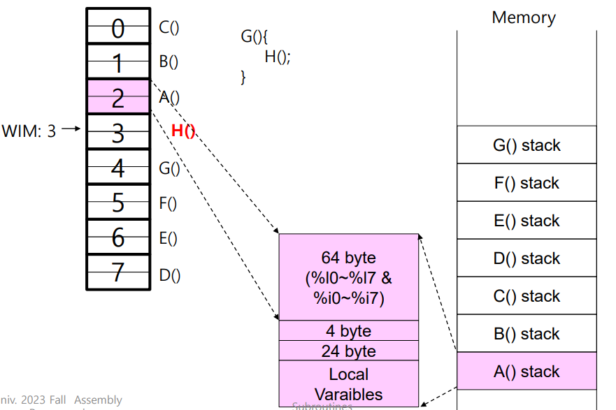 위와 같이, CWP = 2, WIM = 3 인 상황에서 서브루틴 G() 호출 이후, 그 내부에서 H() 를 호출하면 오버플로우가 발생하고,