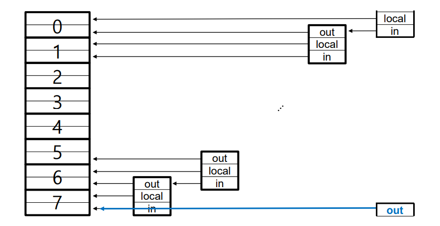 각 register set 은 함수가 호출 될 때마다, (꼭 7번이 시작일 필요는 없지만) 높은 곳부터 낮은 곳을 향해 감소하는 방향으로 할당된다. (global 레지스터가 있는 곳이 높은 쪽이다.)