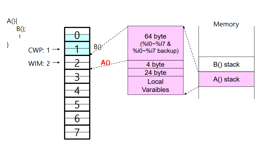 save, restore 명령어가 호출되면, CPU는 CWP, WIM 값을 읽어 오버플로우, 언더플로우 여부를 확인한다.
