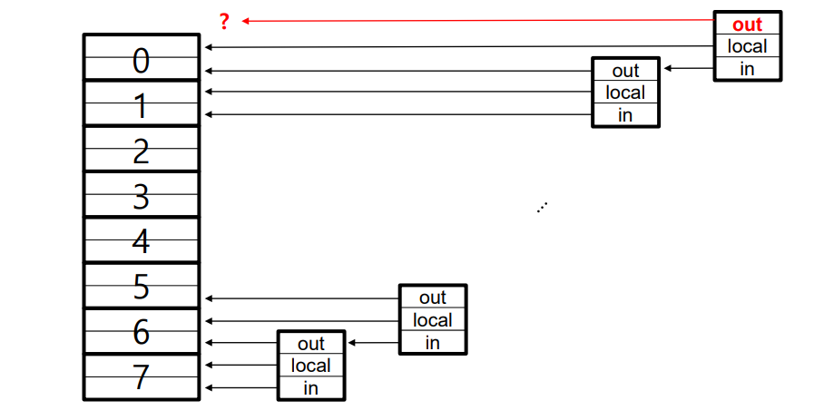 비록 0번째 register set 은 비어있지만, 새로 호출한 서브루틴의 out-register 를 위한 공간은 기존에 사용중이던 7번째 register set 을 침범할 수 밖에 없기 때문이다.