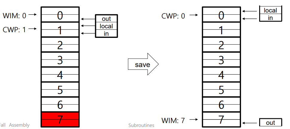 만약 오버플로우/언더플로우가 확인되면(CWP == WIM 이면), trap (또는 시스템콜)이 발생한다.