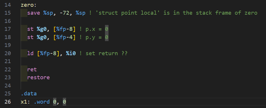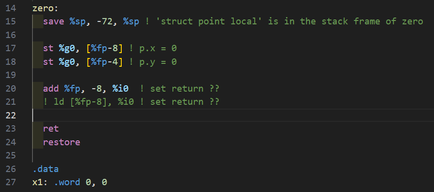 그 결과 main 함수의 %o0 에는 0이 들어가고, 이 값을 x1 의 주소에 저장하면, 실질적으로 x1.x = 0 만 저장되고 나머지는 아무것도 저장되지 않는다.