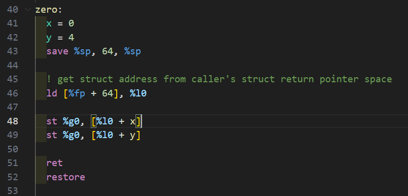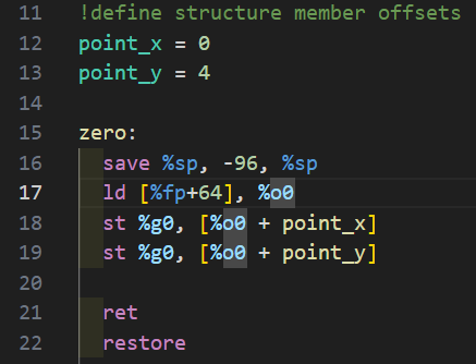 zero 함수의 스택프레임의 %fp - 8 이 구조체의 시작위치인 동시에 구조체 포인터이기도 한데,