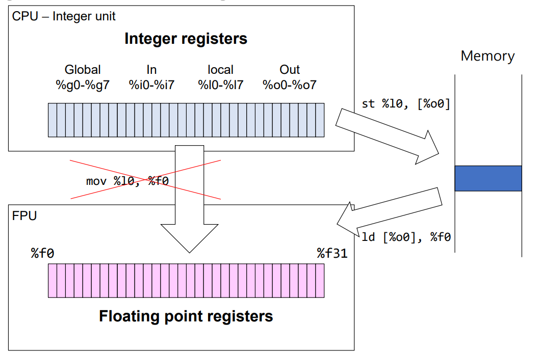 이쯤에서 CPU 의 Integer Unit (Integer Register) 과 FPU (Floating point register) 사이에 데이터를 주고 받는 방법을 정리해보자.