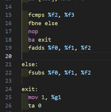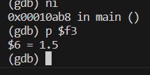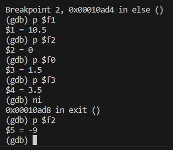 결과를 확인해보니 c != d 이므로 else 문으로 잘 들어갔고, else 문의 fsubs 명령어 실행 결과로 -9 도 c에 잘 저장되었다.